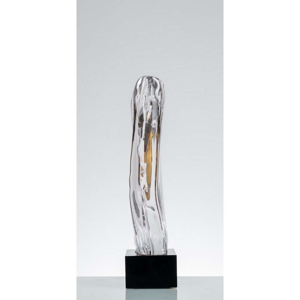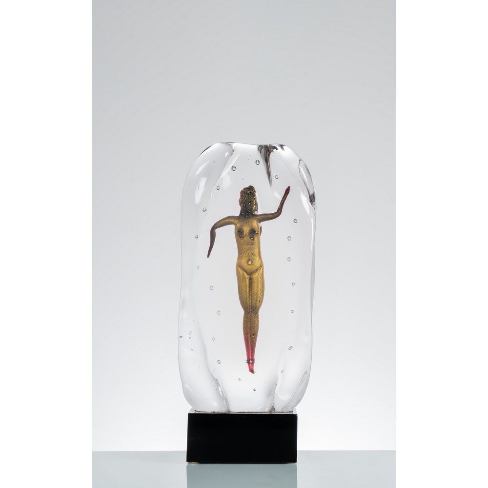 Blocco scultoreo “La pescatrice di Perle” in vetro massiccio incolore con figura in oro, base rettangolare in vetro nero. Firma postuma alla base “Seguso”.