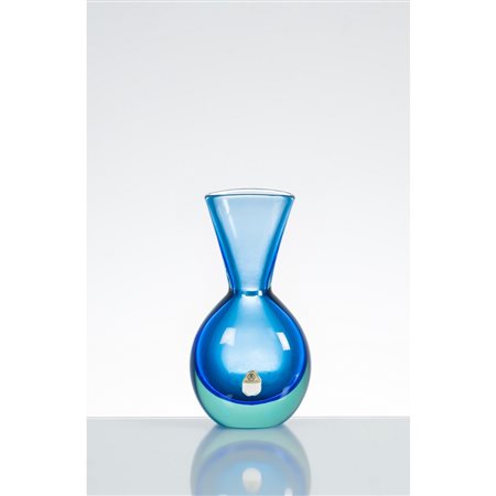 Vaso modello “11824” (variante bassa) in vetro sommerso blu azzurrino con corpo sferico, bocca circolare piana e collo svasato. Etichetta di produzione.