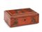 SCATOLA IN LEGNO LACCATO, XVIII SECOLO, rettangolare con coperchio incernierato, decori a figure orientali e paesaggi su fondo rosso; usure e sbeccature.