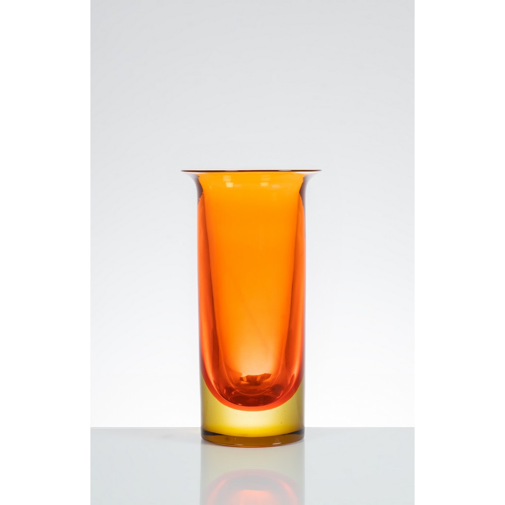 Vaso modello “12699” in vetro sommerso giallo, rosso e arancione con corpo cilindrico, bocca circolare piana e basso collo lievemente svasato.