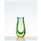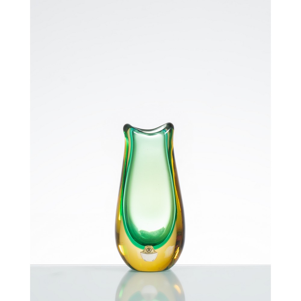 Vaso modello “11424” in vetro sommerso giallo e verde con corpo a goccia, bocca ondulata. Etichetta di produzione.