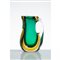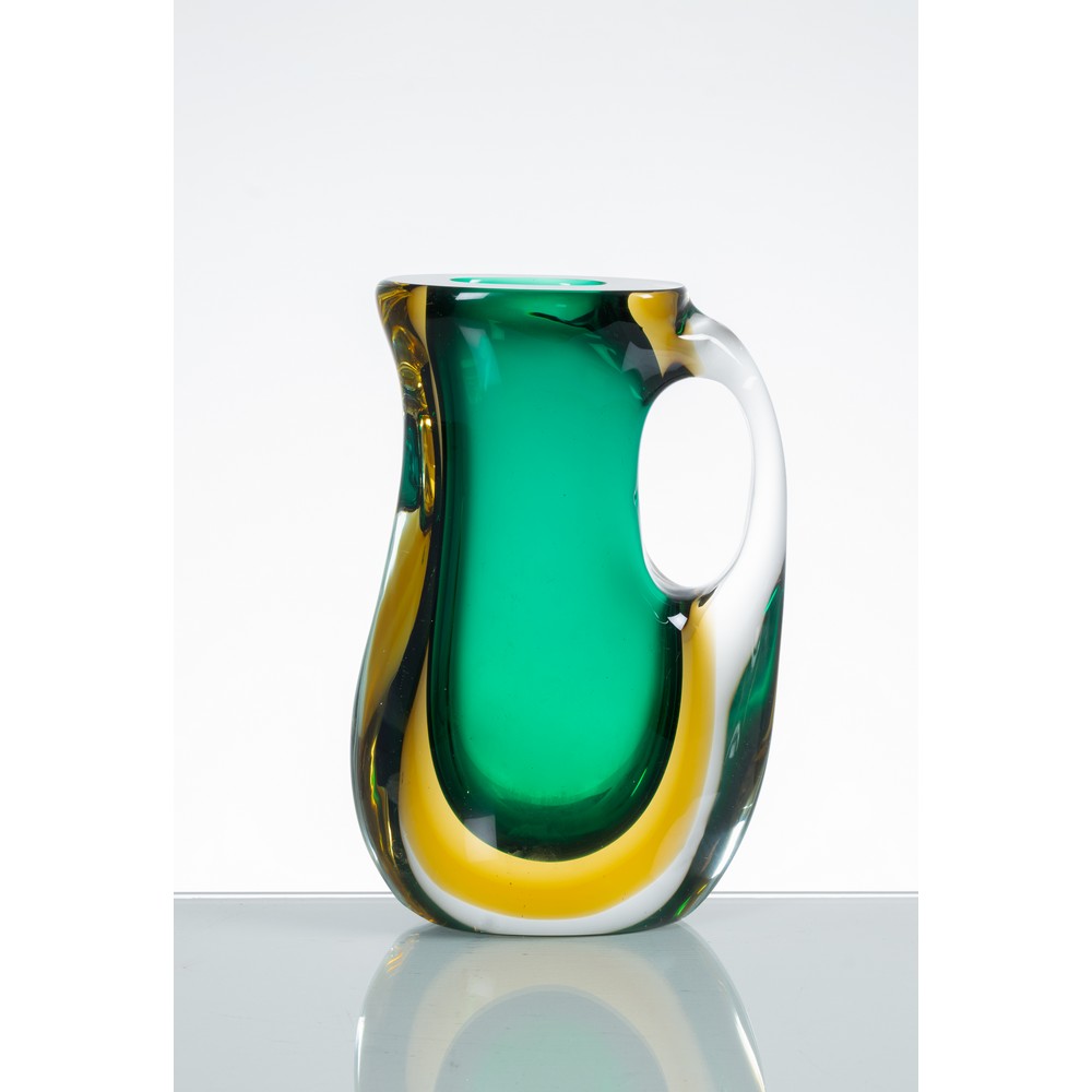 Vaso in vetro sommerso incolore, giallo e verde, corpo a brocca con cavità laterale, con bocca circolare.
