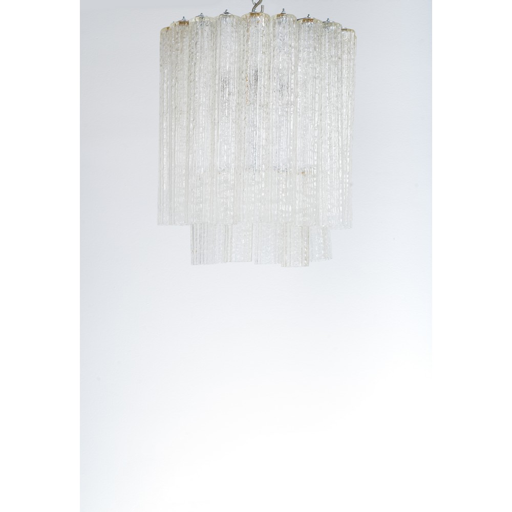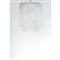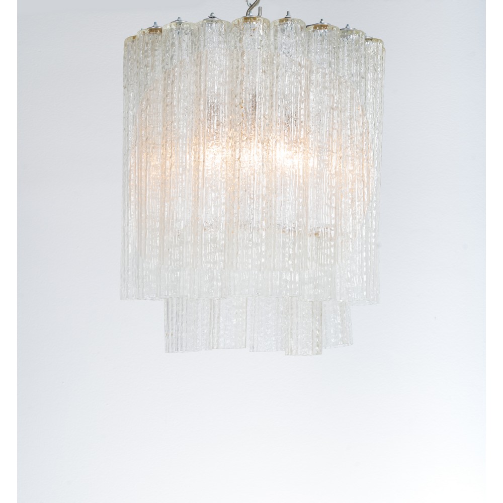 Lampada a sospensione a quattro luci, corpo cilindrico su due piani, diffusore composto da elementi cilindrici modulari a “Tronchi” in vetro incolore a corteccia, struttura in metallo.