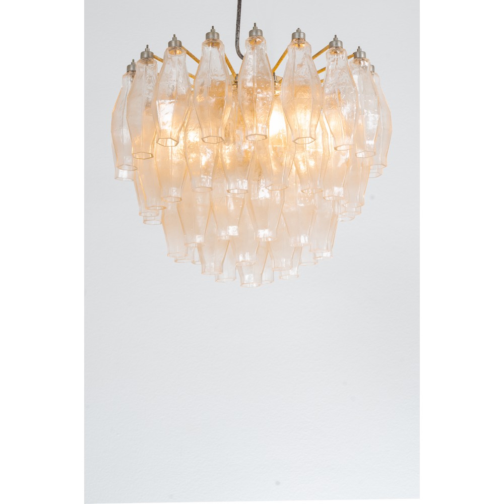 Lampada a sospensione a nove luci della serie “Poliedri”, struttura in metallo verniciato con diffusore composto da elementi Poliedri, realizzati in vetro soffiato cristallo trasparente disposti su più livelli.