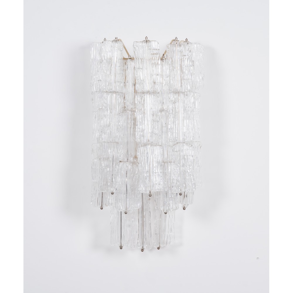 Lampada da parete a cinque luci, struttura in metallo, diffusore composto da elementi modulari a “Tronchi” in vetro incolore a corteccia. Marchio di produzione incusso.
