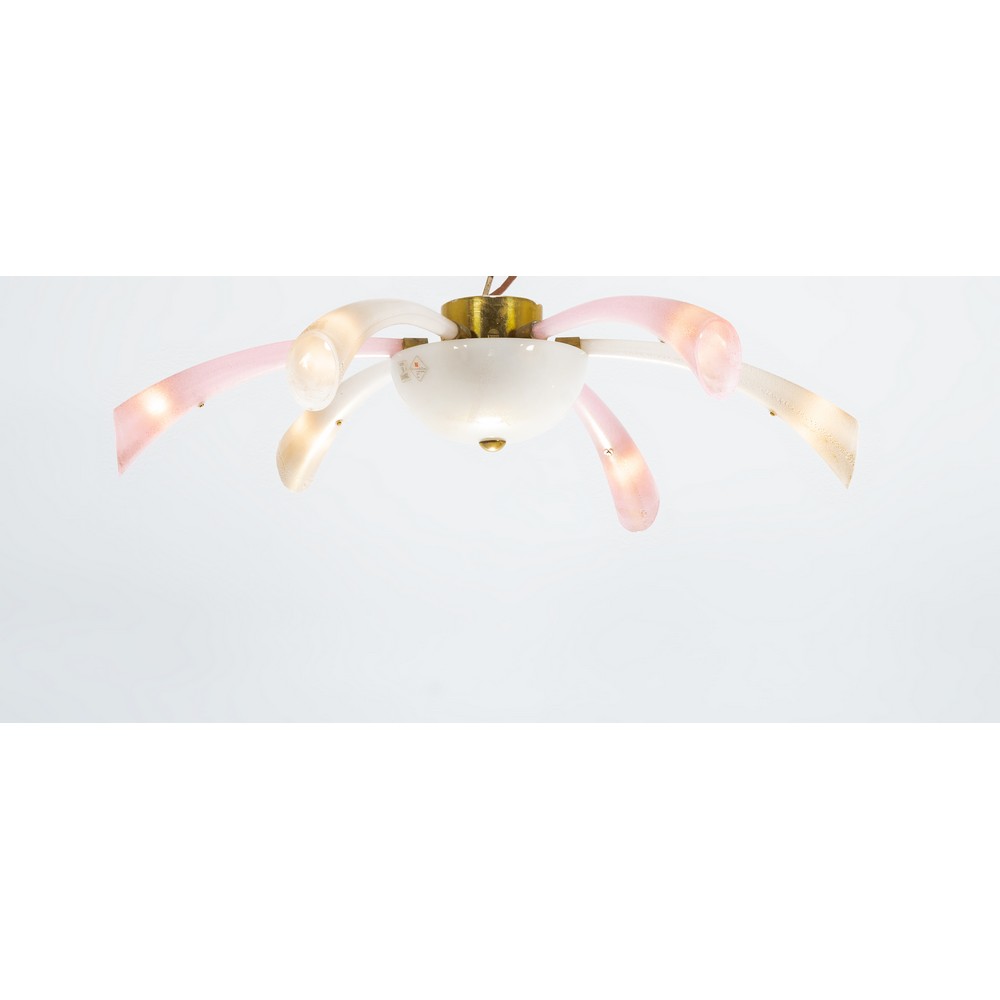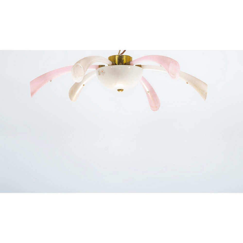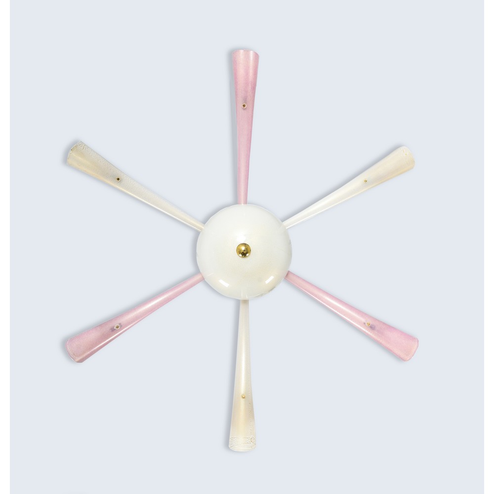 Lampada da soffitto a sei luci modello “Fuoco d’artificio” struttura in ottone, bracci e coppa in vetro soffiato con inclusione di foglia oro rosa e avorio.
