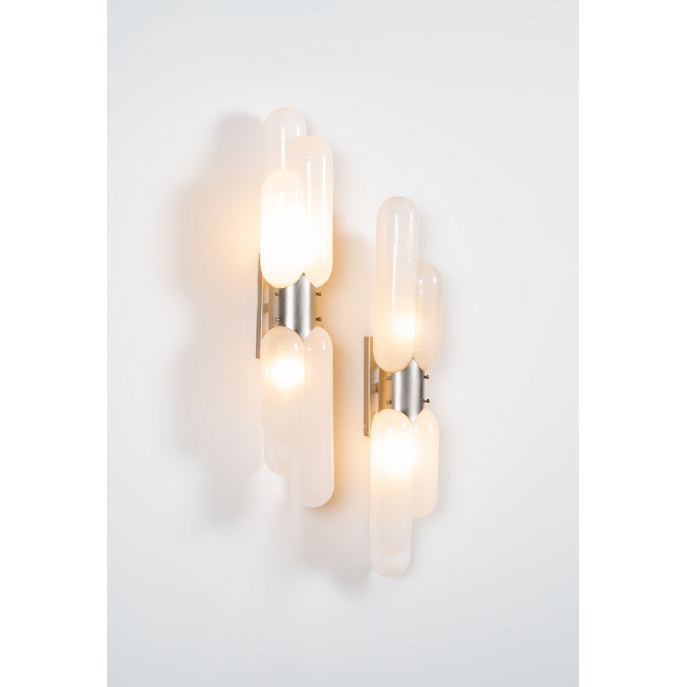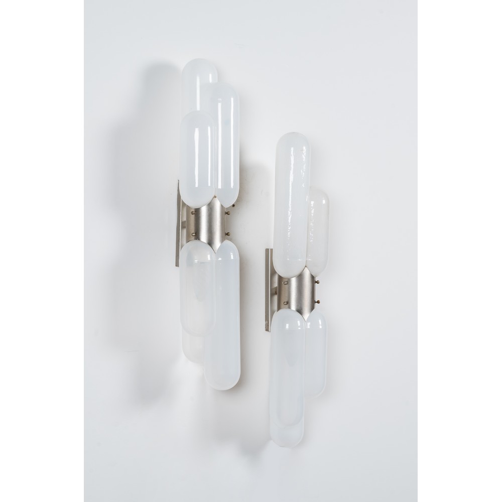 Coppia lampade da parete a due luci modello “Torpedo”, struttura in metallo cromato con diffusori cilindrici in vetro opalino.