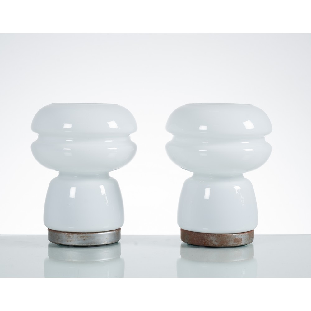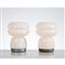 Coppia di lampade da tavolo ad una luce modello “Mushroom”, corpo sagomato in vetro opalino lattimo.