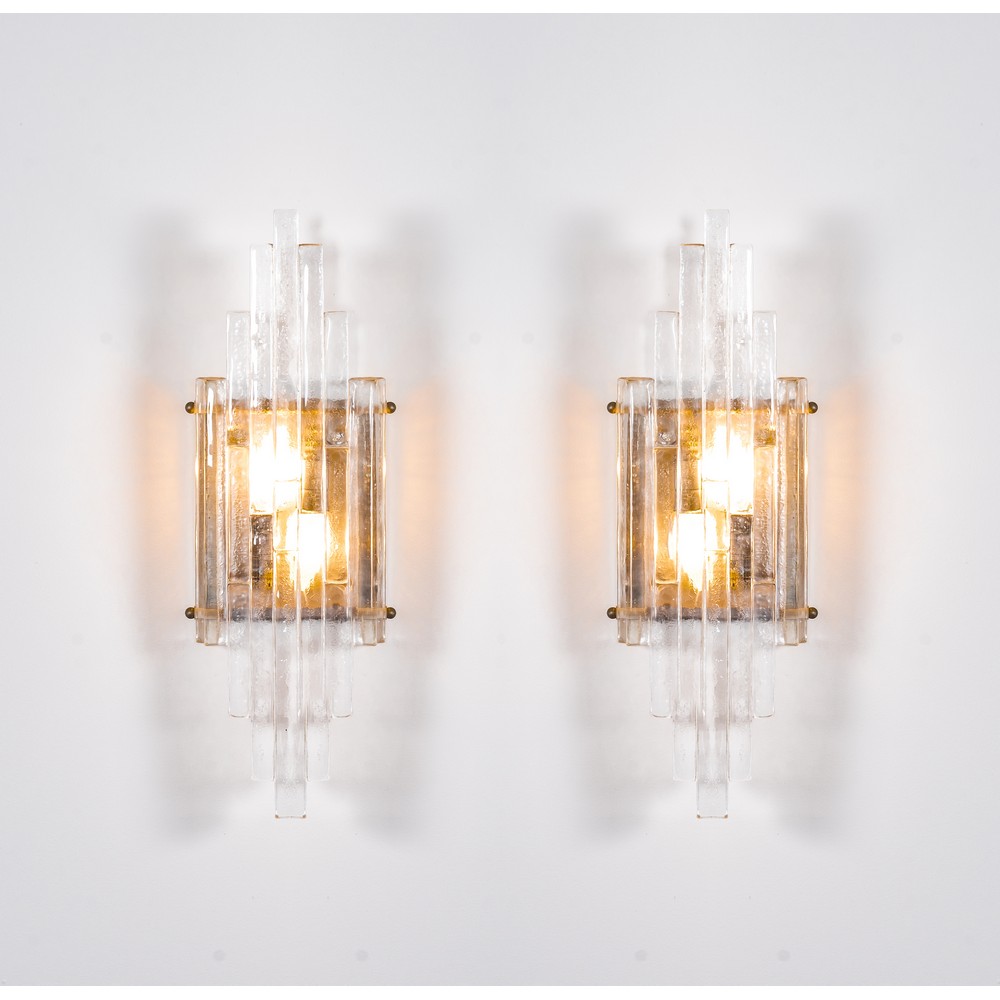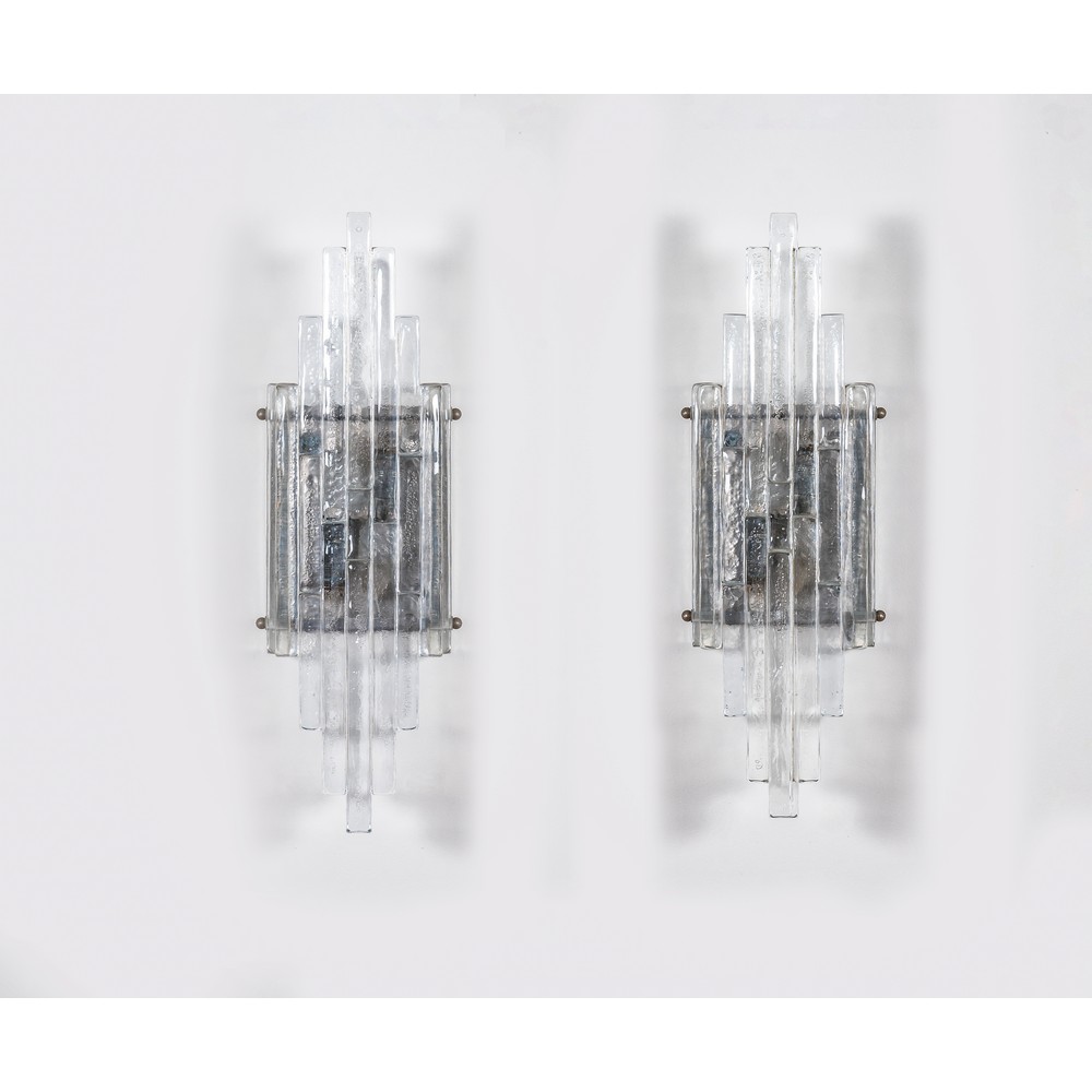 Coppia di lampade da parete a due luci, struttura in metallo cromato, diffusori composti da listelli di vetro massiccio incolore. Minuterie in metallo.