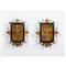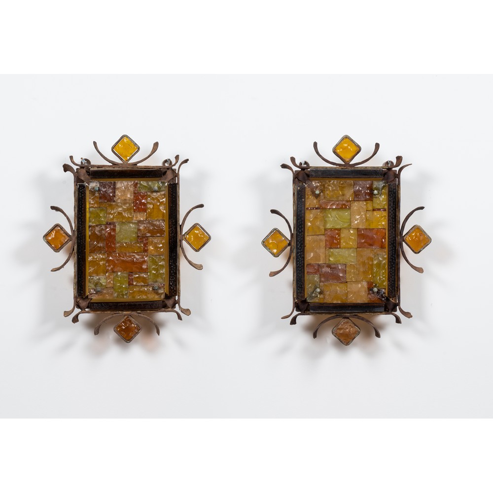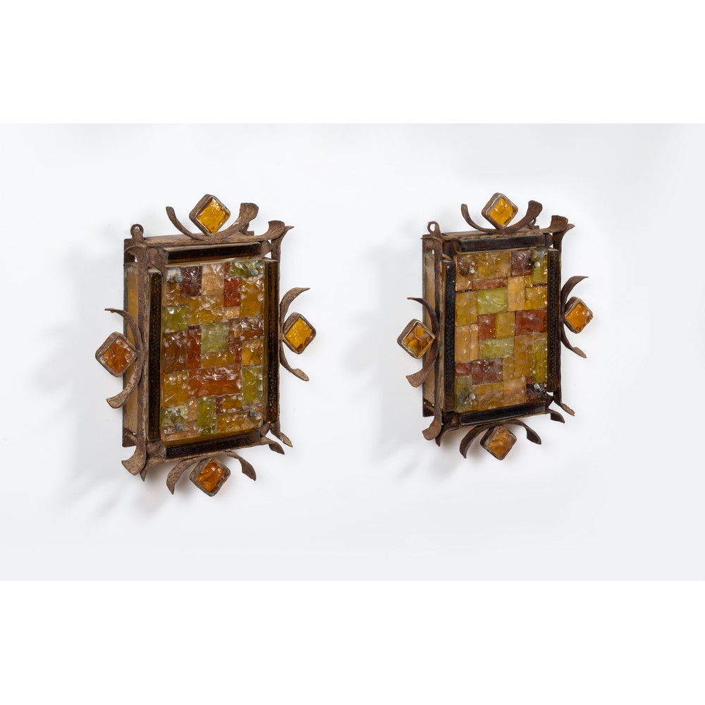 Coppia di lampade da parete a due luci, struttura in ferro forgiato, diffusore rettangolare decorato con vetri colorati ambra di grosso spessore tagliati a scalpello. Impianto elettrico da rifare.