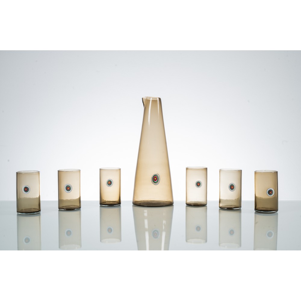 Servizio composto da caraffa e sei bicchieri in vetro fumè decorato con murrine a pastiglia in vetro policromo.