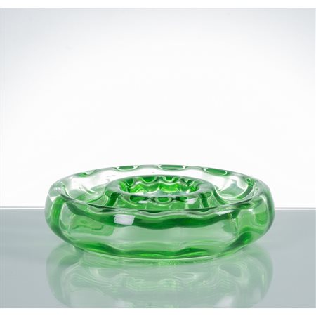 Svuota tasche in vetro soffiato verde a larghe costolature, corpo circolare con concavità centrale. Etichetta Auras.