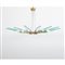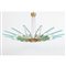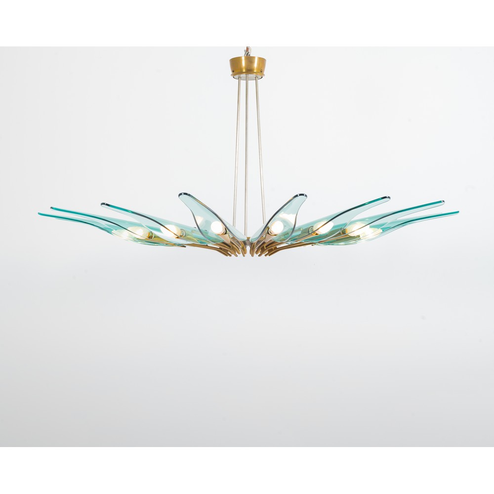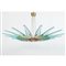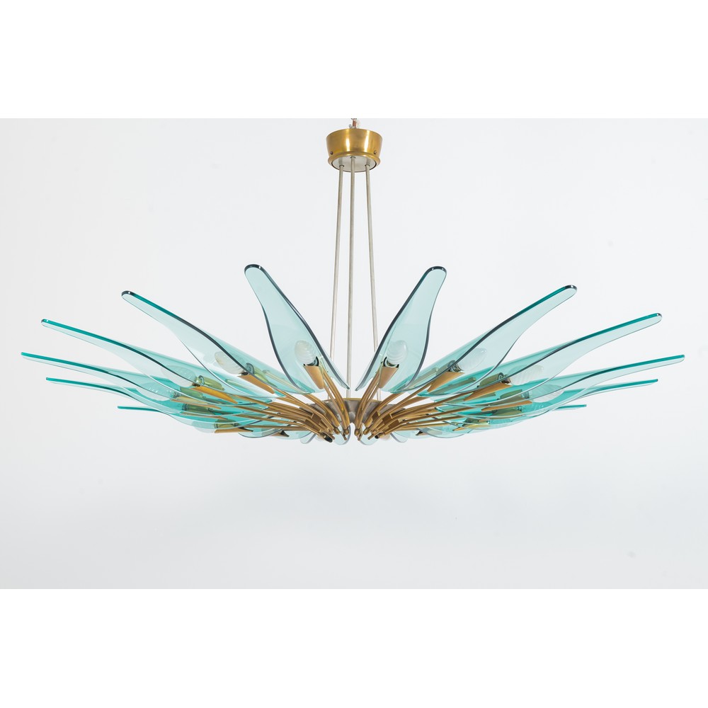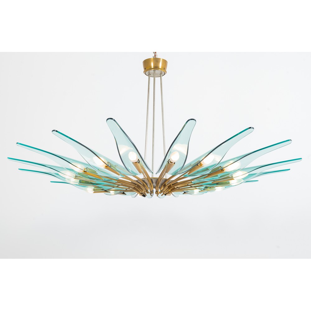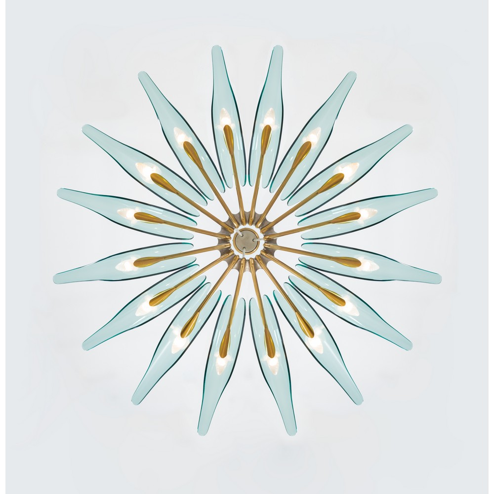 Lampada a sospensione a sedici luci modello “1563”, struttura in ottone e diffusore in cristallo molato e in cristallo curvato molato. Lampadario Dahlia mod. 1563/A in ottone con diffusori in cristallo colorato, curvato e molato.