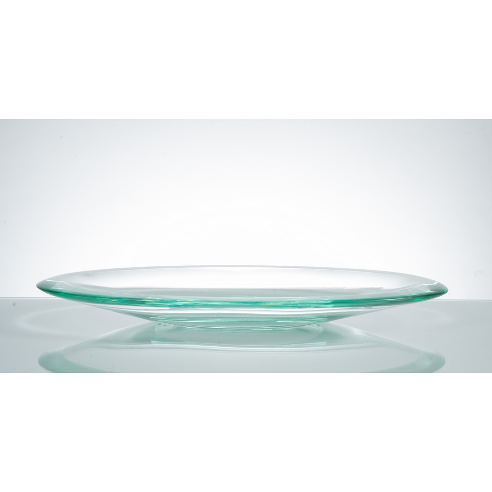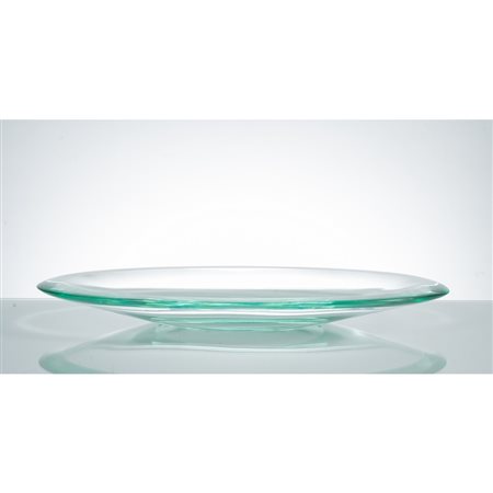 Grande e raro centrotavola in cristallo verde Nilo di grosso spessore, corpo ovalizzato lievemente curvato, bordi molati. Marchio di produzione.