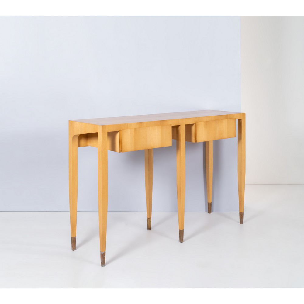 Consolle in legno di acero piano rettangolare, sul fronte due cassetti, fianchi con sezione inclinata, gamba quadrangolare con finali in ottone. Certificato di autenticità Archivio Ponti.