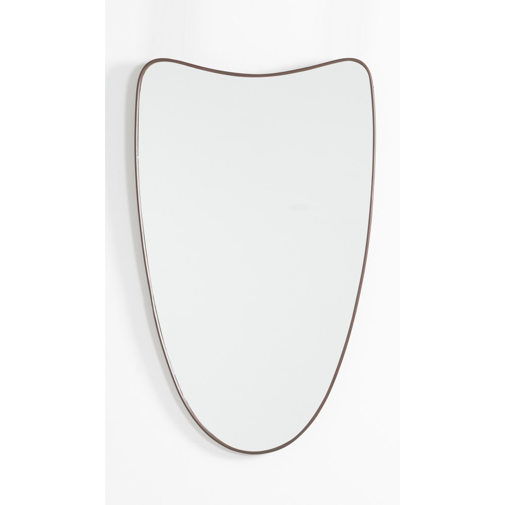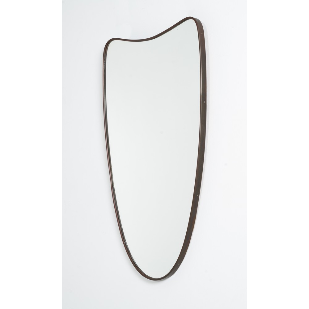 Specchio da parete con corpo a scudo, curvato nell’ estremità superiore, cristallo specchiato ed ottone lucido.