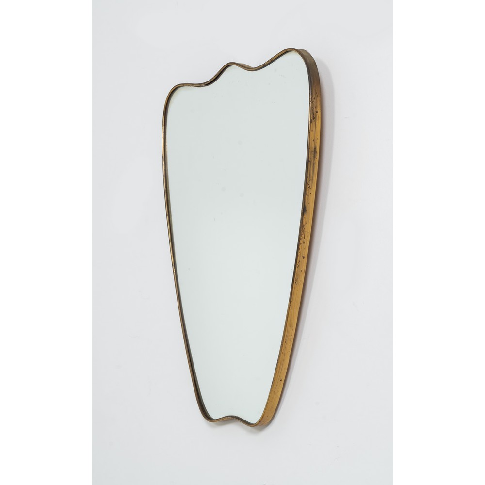 Specchio da parete a scudo con cornice sagomata in ottone, cristallo specchiato.
