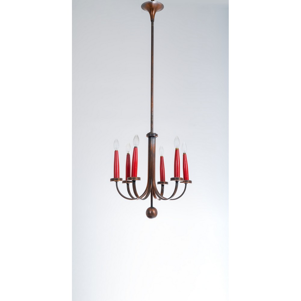 Lampada a sospensione a sei luci con struttura e bracci in rame, diffusori a candela in legno laccato rosso.