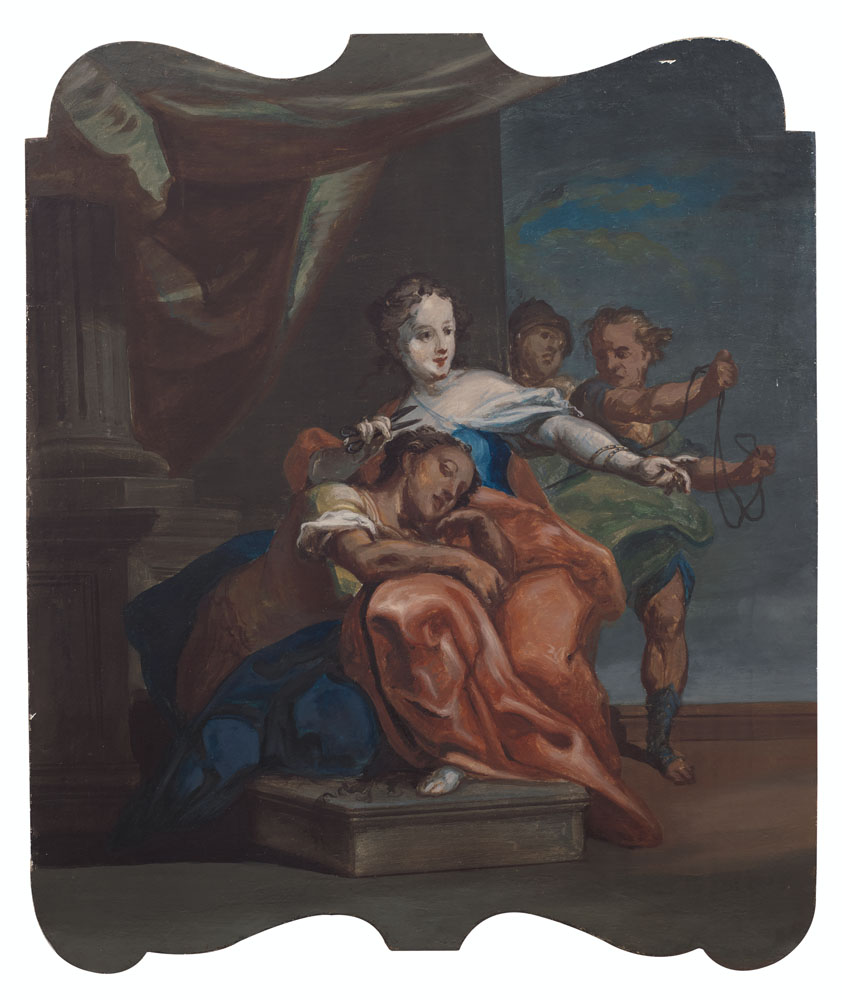 PITTORE DEL XVIII SECOLO Sansone e DalilaOlio su tela sagomata, cm 111x95;...