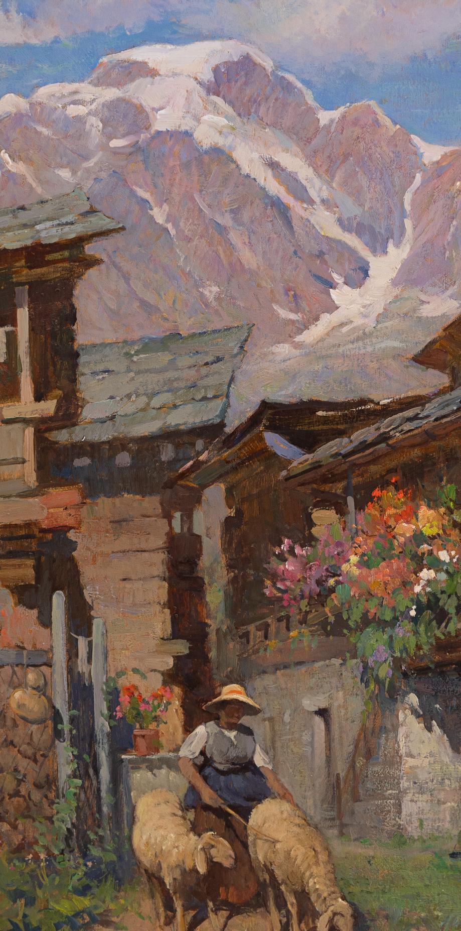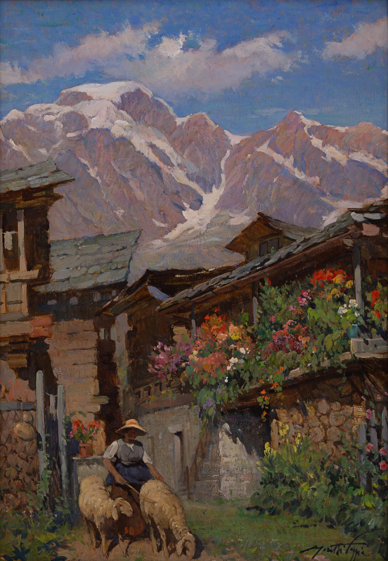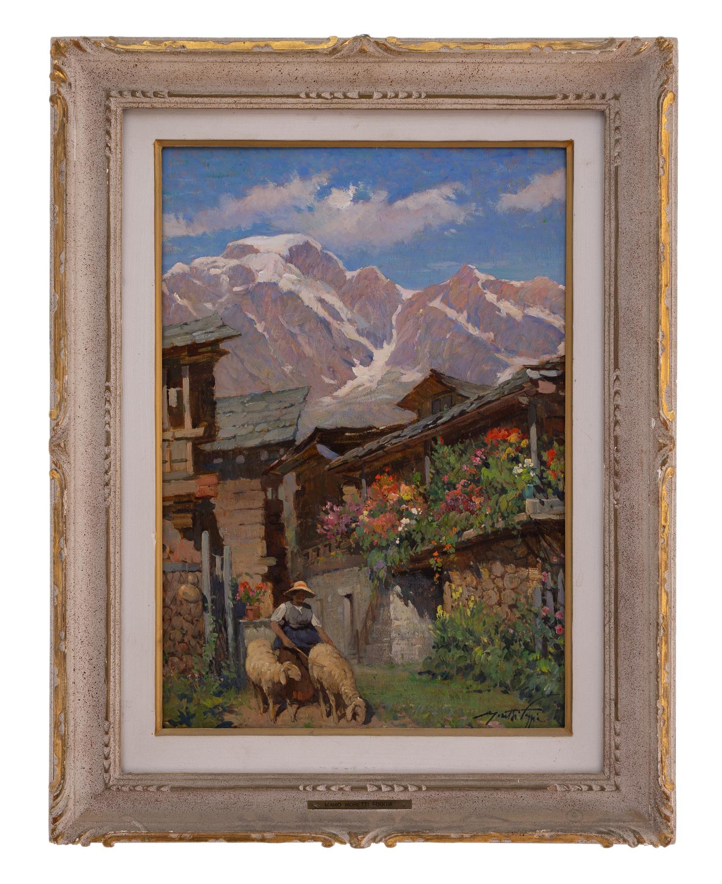 Mario Moretti Foggia - Baita fiorita - Mantova 1882 - Pecetto di Macugnaga VB 1954 - Olio su tavola cm 45,5x32,5 - Mario Moretti Foggia è stato un rinomato pittore italiano nato il 25 dicembre 1882 a Mantova. La sua formazione artistica lo ha portato ad apprendere presso prestigiose istituzioni, tra cui l'Accademia Cignaroli a Verona e l'Accademia di Brera a Milano. Durante il suo percorso formativo, ha avuto la fortuna di essere istruito da eminenti maestri dell'arte come Mosè Bianchi, Giuseppe Mentessi e Cesare Tallone.Foggia si è distinto come un abile paesaggista e ritrattista, utilizzando varie tecniche pittoriche come olio, tempera, acquarello e fresco per esprimere la sua creatività. Il suo debutto ufficiale nel mondo dell'arte è avvenuto a Milano nel 1902. Nel corso della sua carriera, ha ricevuto numerosi riconoscimenti, tra cui medaglie d'oro all'Esposizione di Mantova per l'insieme delle sue opere nel 1902, a Milano nel 1908 con l'opera "Fratellanza" e a Como nel 1909 grazie al dipinto "Fresca Mattinata". Nel 1925, ha ottenuto il prestigioso Premio Cassani a Milano per il dipinto "L'ora del rosario".Tra il 1920 e il 1926, Foggia ha esposto con successo a Venezia, presentando opere come "Nel cantuccio di Venezia", "Nel Campiello", "Nevicata" e "Compiacenze materne". Nel 1927, a Firenze, in occasione dell'ottantesima Esposizione Nazionale di Palazzo Pitti, ha presentato le opere "Vera" e "Sole invernale". Tra le sue opere più celebri si trova il "Trittico dei Magi" (Ecce sidus, Imus, Adoremus), conservato presso la Galleria d'Arte Moderna di Milano, e "Danza la circassa", esposta presso la Galleria del Palazzo Ducale di Mantova.Le opere di Mario Moretti Foggia sono state incluse in importanti collezioni, tra cui quella del Quirinale, e sono state esposte in gallerie pubbliche e private in Italia, Svizzera, Stati Uniti e America Latina. Foggia era un instancabile viaggiatore, che trascorreva lunghi periodi in Oriente per studiare costumi e paesaggi, le cui ricerche sono state esposte con successo a Londra, Parigi e Bruxelles.Partecipando a numerose mostre collettive nazionali e internazionali, Mario Moretti Foggia ha consolidato la sua reputazione come uno dei pittori più influenti della sua epoca. Nel corso della sua carriera, ha realizzato dieci mostre personali, tutte accolte con entusiasmo da parte di pubblico e critica.Mario Moretti Foggia si è spento nel 1954 a Pecetto di Macugnaga, lasciando dietro di sé un prezioso e duraturo contributo all'arte italiana.