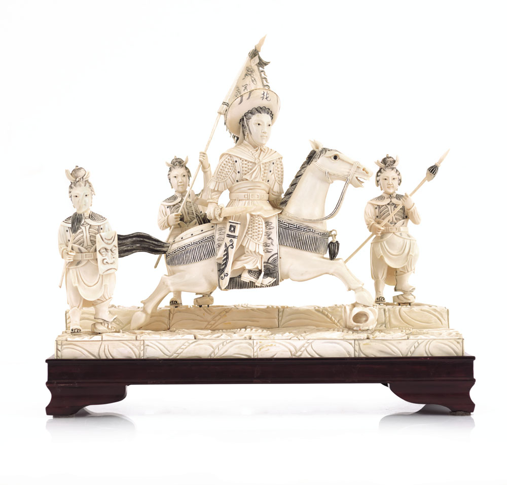 GRANDE GRUPPO IN AVORIO, CINA, INIZIO XX SECOLO, raffigurante cavaliere e soldati su base in legno.