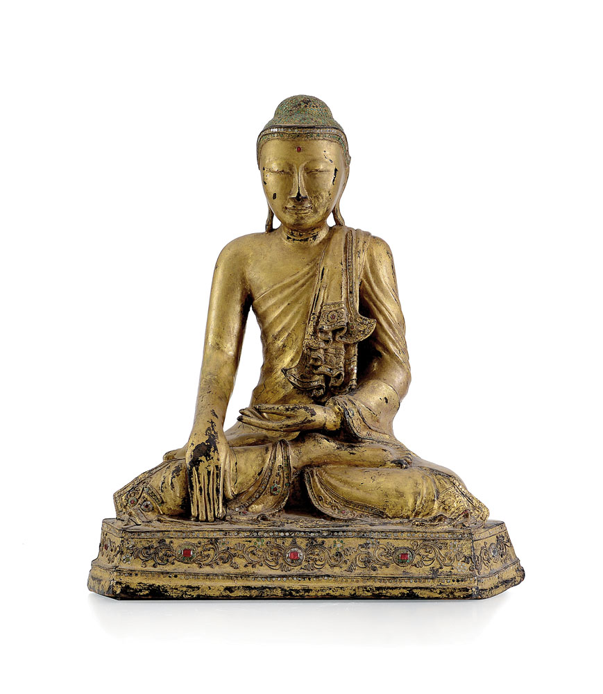 SCULTURA BUDDHA SEDUTO IN LEGNO DORATO CON APPLICAZIONI, BIRMANIA, XIX...