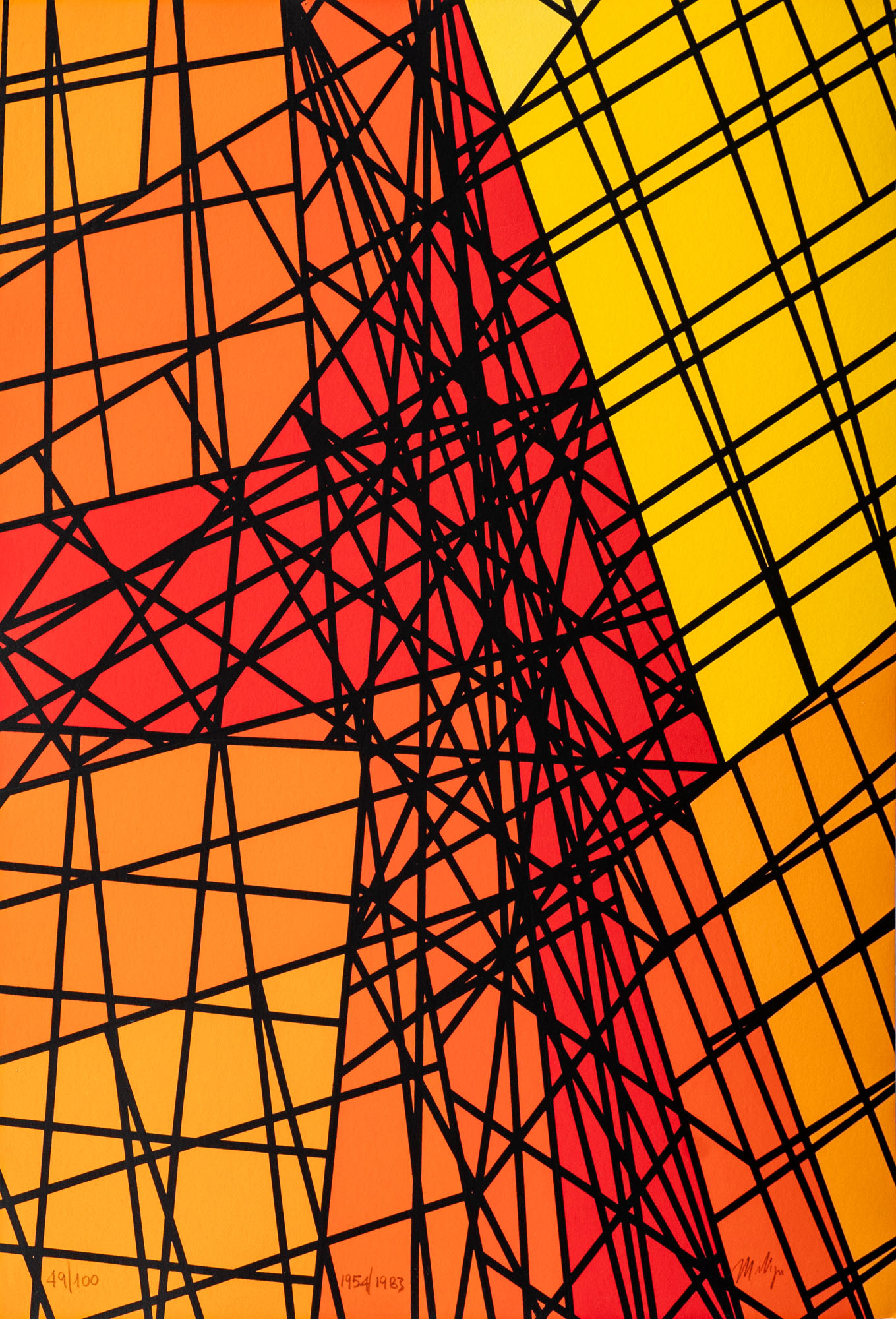 MARIO NIGRO(1917 - 1992)Tensioni reticolari: tempo e spazio-simulltaneità di elementi in lotta1954-1983Serigrafia, es. 49/100, tavola n. 7 dalla cartella 'Mario Nigro. 10 opere grafiche dal 1948 al 1955', Edizioni Centro RS, Como48 x 33 cmFirmata a matita in basso a destra, datata in basso al centro e numerata in basso a sinistraPROVENIENZA:Collezione privata, Milano
