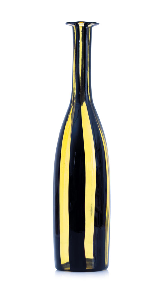 BOTTIGLIA IN VETRO A CANNE, VENINI, F.BIANCONI, ANNI '60, giallo e nero, firma ad acido "venini murano ITALIA".