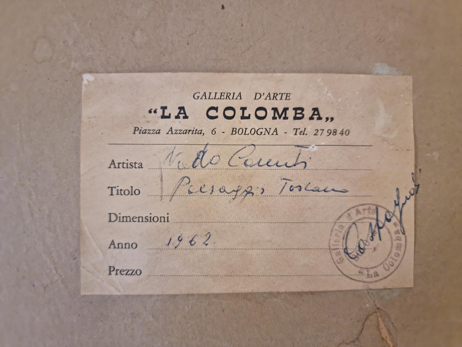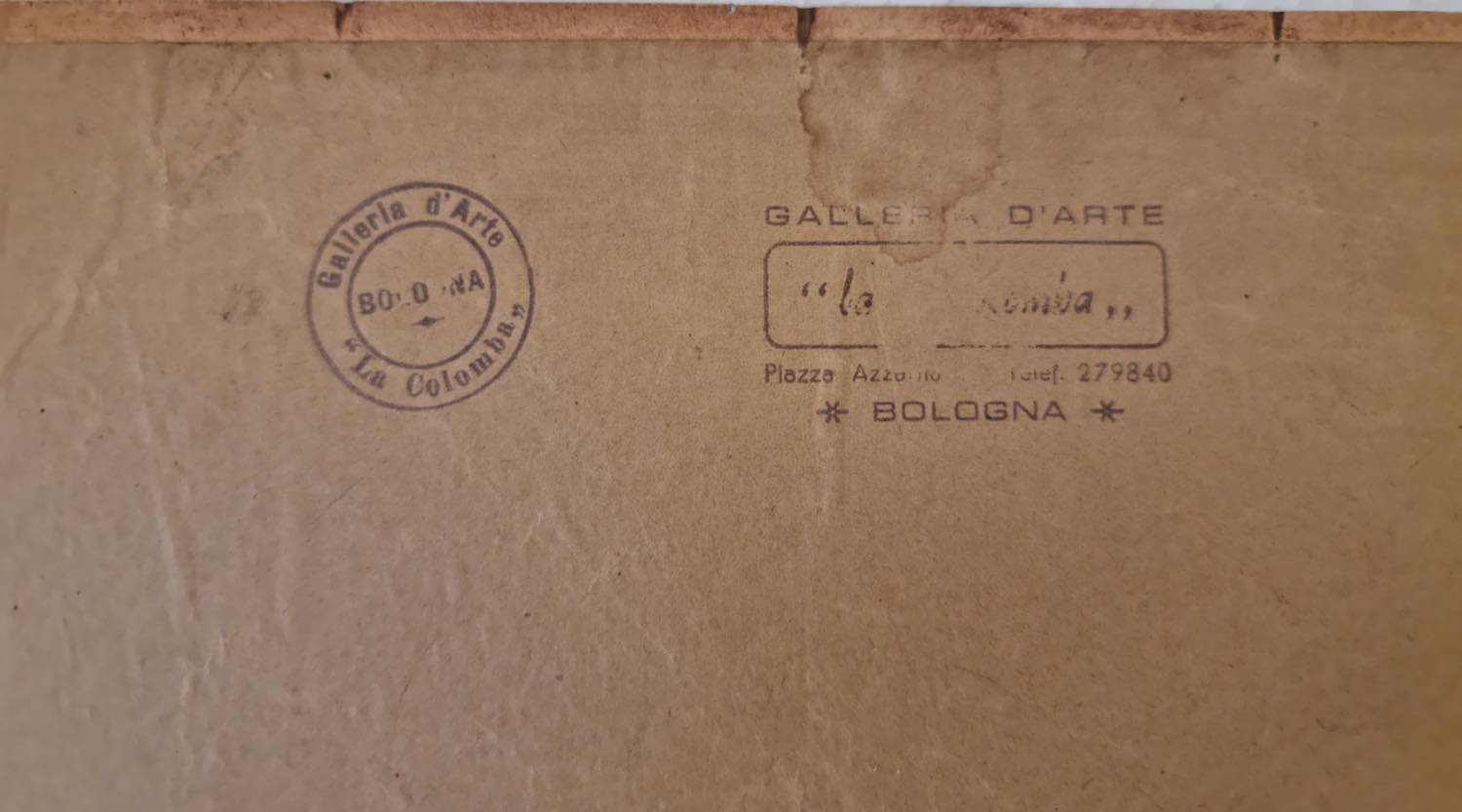 Olio su cartone, firmato in basso a destra, reca al retro Timbri e Etichetta della Galleria La Colomba - Bologna con autore, titolo e anno, H cm 36x50 - con cornice H cm 52x66. Provenienza: Galleria La Colomba - Bologna; Collezione privata - Bologna.