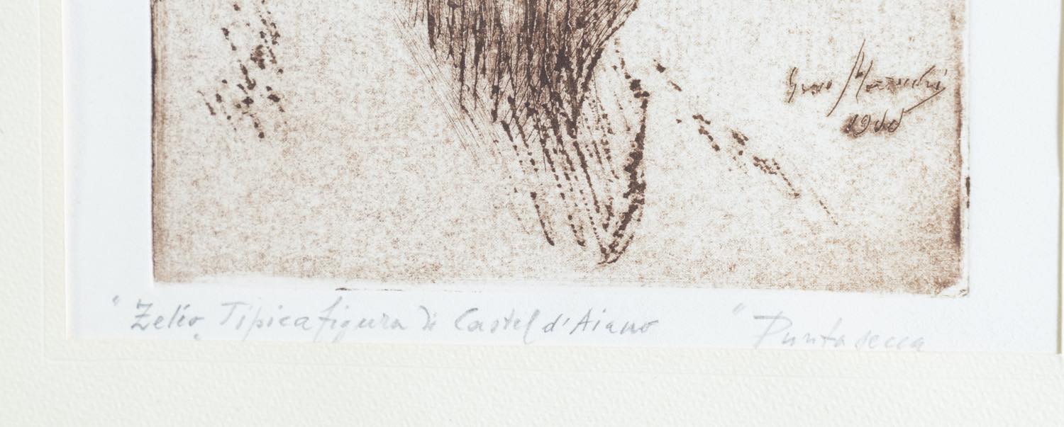 Puntasecca su carta, firmata e datata nella lastra, reca in basso a sinistra iscrizione “Zelio - Tipica figura di Castel d’Aiano” e in basso a destra “Puntasecca”, Lastra H cm 24x17 - con cornice H cm 42x33.