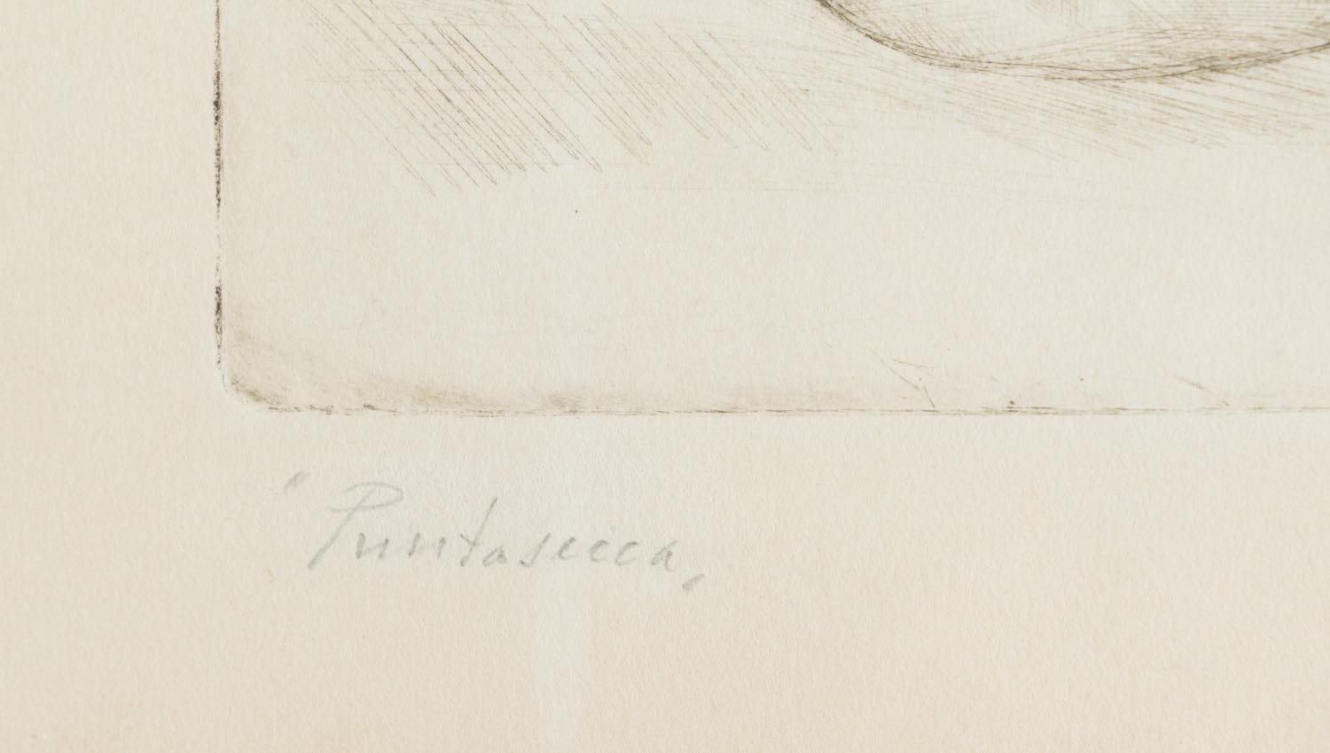 Puntasecca su carta, firmata e datata in basso a destra, reca in basso a sinistra iscrizione “Puntasecca”, Lastra H cm 12x21 - con cornice H cm 23.5x33 (lieve difetto).