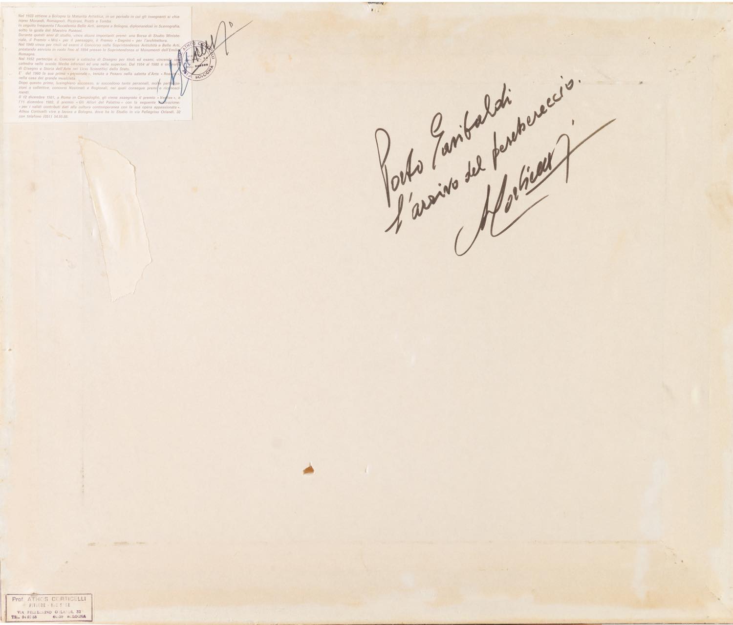 Olio su cartone telato, firmato e datato in basso a destra, reca al retro titolo, firma, timbro ed etichetta dell’artista, H cm 21.5x32 - H cm 62. Provenienza: Collezione Privata - Bologna.