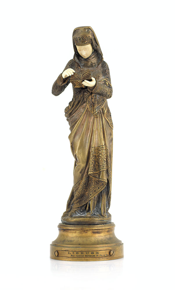 Bronzo dorato e avorio, alt. cm 25; firma in pasta "A.Carrier Belleuse"; targhetta con titolo e autore sul fronte.