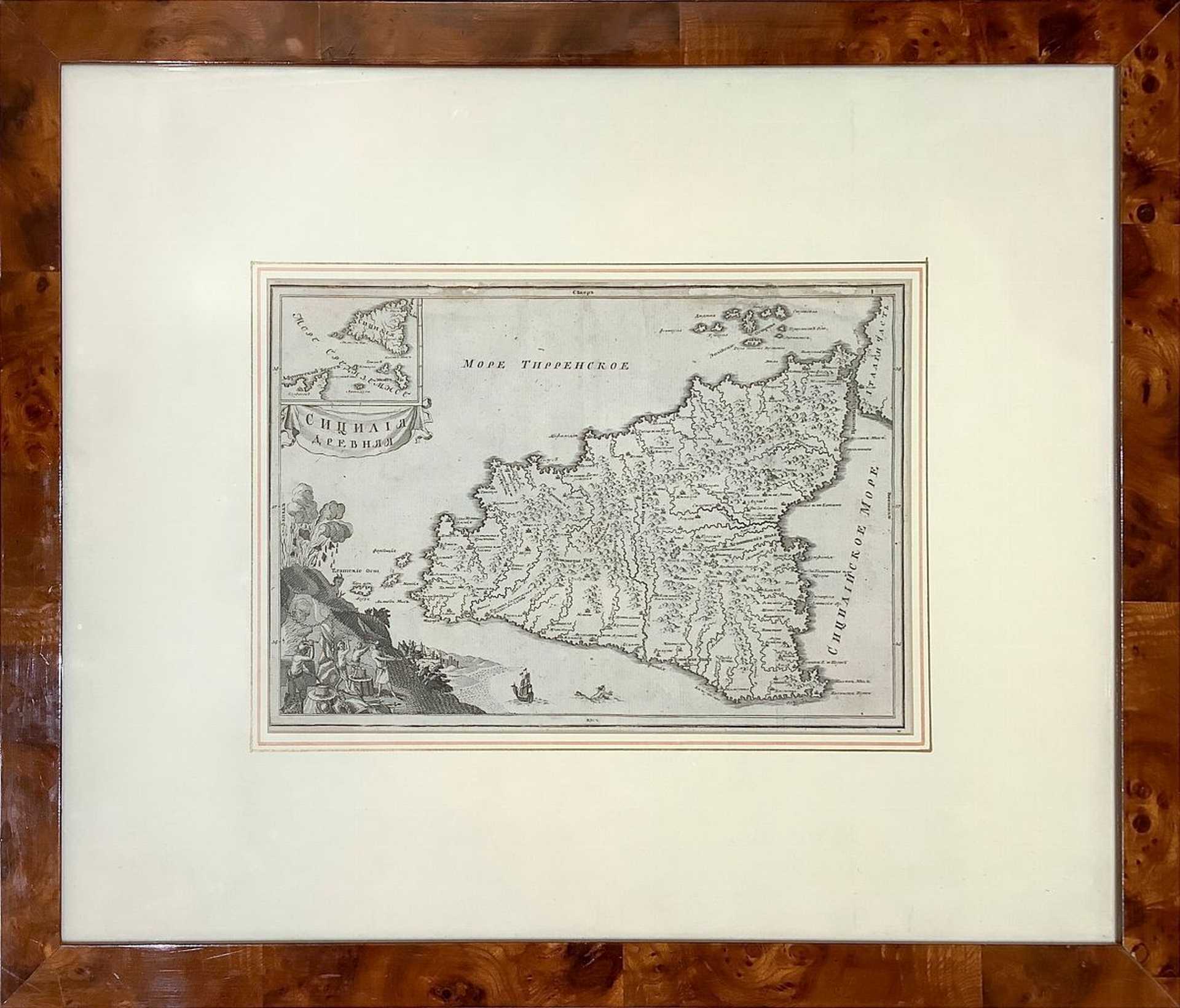 Isaac Basire (1704-1768) - Antica carta della Sicilia, 1711 220x320 mm Incisione su rame Antica carta della Sicilia in lingua russa, tratta da Andreas Cellarius (1596 - 1665).