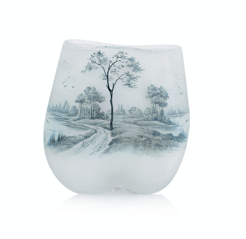 COPPETTA IN VETRO DOPPIO, DAUM NANCY, 1895 CA., PITTORE DUFOUR, collo trivalve, decoro a smalti "en grisaille" a paesaggio costiero con velieri; firma in oro "Daum Nancy" con croce di Lorena.