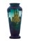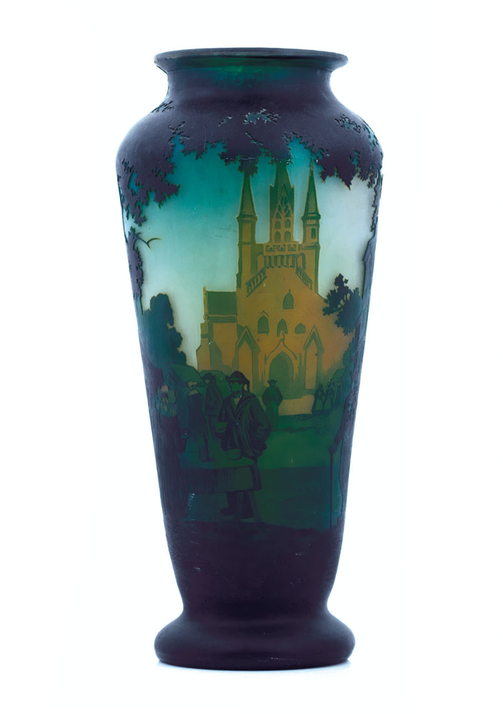 GRANDE VASO IN VETRO DOPPIO, MULLER FRERES LUNEVILLE, 1924 CA., a balaustro, decoro a paesaggio bretone cittadino con figure in bruno, verde e arancio inciso ad acido su fondo azzurrato, firma in rilievo a cammeo "Muller Freres Luneville".