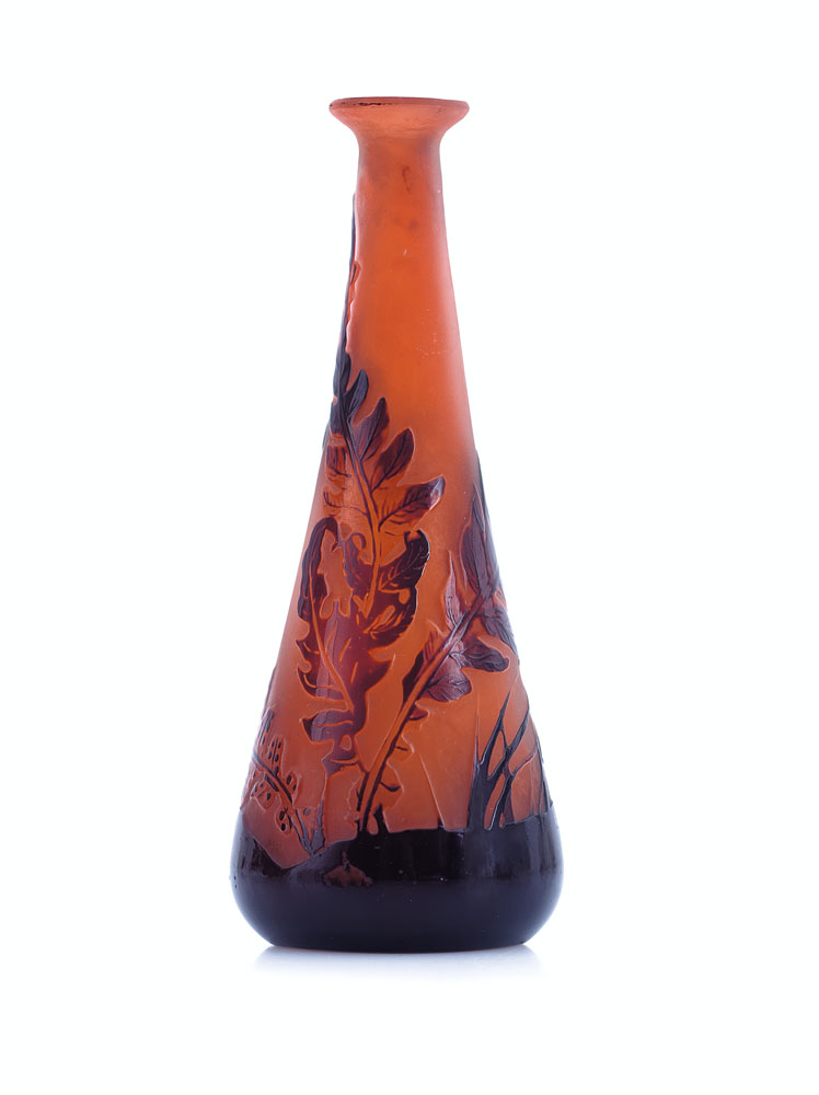 GALLE' VASETTO SOLIFLORE IN VETRO DOPPIO, GALLE', 1900 CA., decoro a felci e...