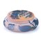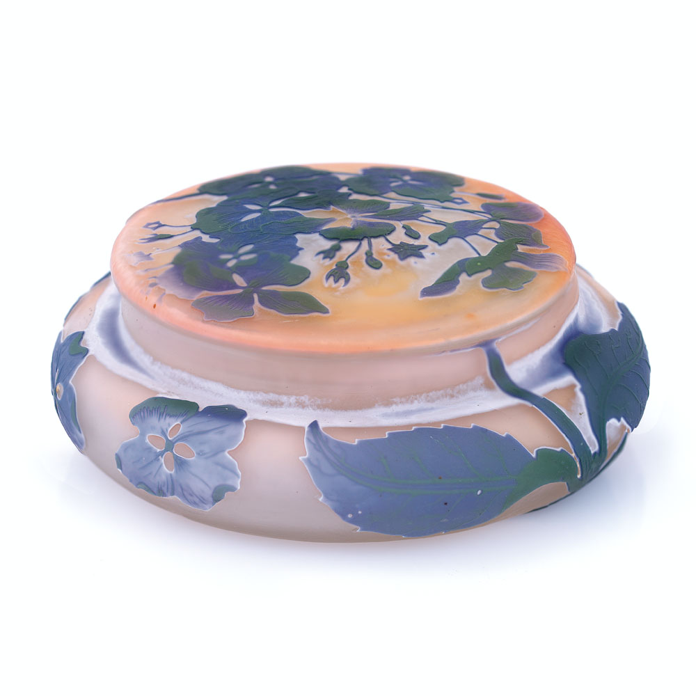 SCATOLA CON COPERCHIO IN VETRO DOPPIO, GALLE', 1905 CA., circolare con decoro a rami con fiori e foglie inciso ad acido nei toni del viola su fondo rosato, firma in rilievo a cammeo "Gallè" con stella.