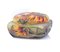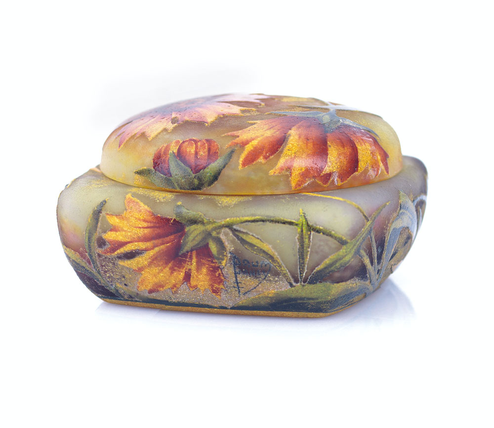 SCATOLA CON COPERCHIO IN VETRO DOPPIO, DAUM NANCY, 1910 CA., decoro a dalie e foglie inciso ad acido e ripreso a smalti policromi su fondo givré maculato, firma dipinta "Daum Nancy" con croce di Lorena.