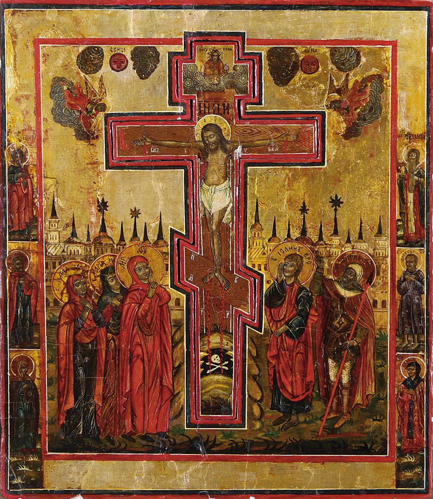 ICONA RUSSA DEL XIX SECOLO Stauroteca con compianto del CristoTempera...