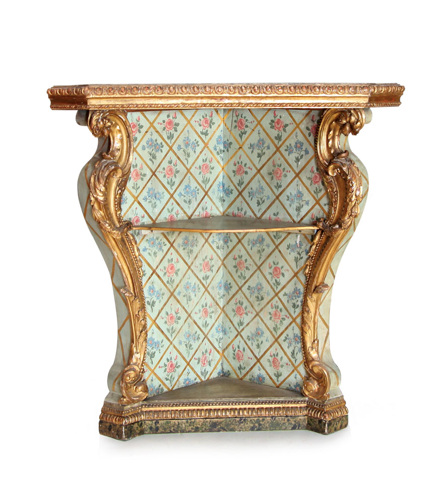 CANTONALE IN LEGNO SCOLPITO, DIPINTO E DORATO, XIX SECOLO, a giorno con due ripiani, montanti a voluta rocaille, decoro floreale entro losanghe; usure.