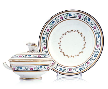 TAZZA DA PUERPERA CON COPERCHIO E PIATTO IN PORCELLANA, REAL FABBRICA FERDINANDEA, NAPOLI, 1790-1800, biansata e cimata da presa a lepre, decoro policromo a festoni fioriti ondulati, filettature e corolle di foglie di vite in oro; fessura al piatto; etichetta "Lukacs-Donath Antichità Roma".