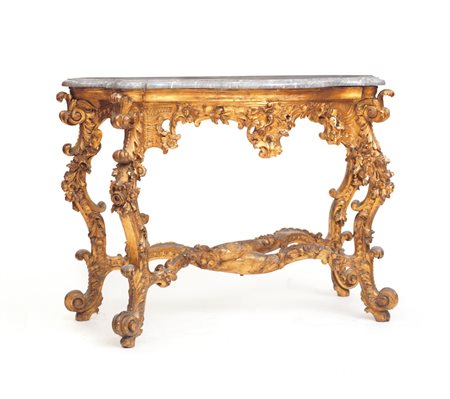 CONSOLE LUIGI FILIPPO IN LEGNO SCOLPITO E DORATO, XIX SECOLO, piano in marmo grigio sagomato, fascia intagliata a rocaille e gambe mosse raccordate alla base; mancanze, sbeccature e usure.
