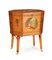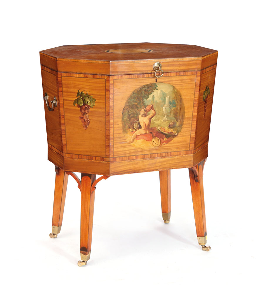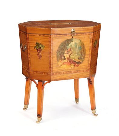 MOBILE DA CENTRO IN LEGNO CHIARO DIPINTO, INGHILTERRA, XIX SECOLO, a sezione ottagonale con piano incernierato e vano interno, gambe a sciabola su rotelle, decori dipinti a scene galanti entro riserve; usure.