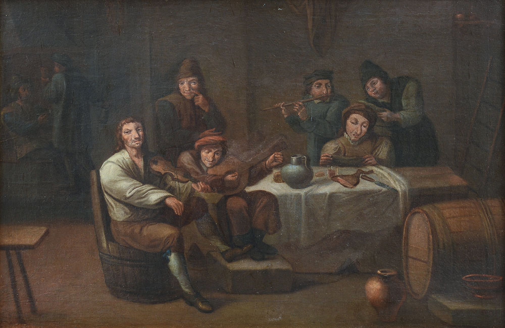 PITTORE FIAMMINGO DEL XVIII SECOLO Interno d'osteria Olio su tela, cm 53,5x81,5.