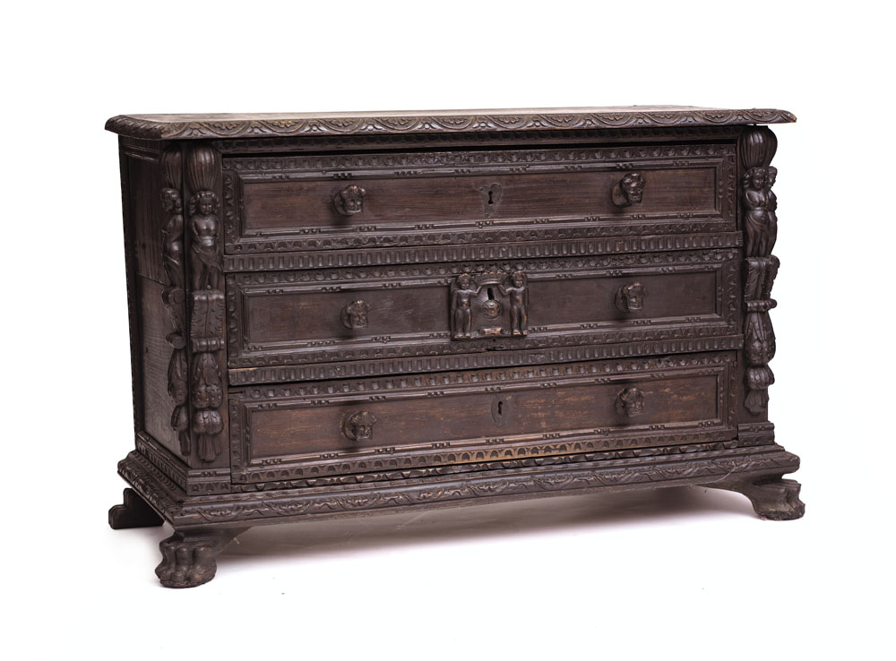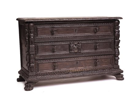 CANTERANO A BAMBOCCI IN NOCE, XVII SECOLO, fronte a tre cassetti con prese a testine, montanti con applicazioni a figure intagliate, piedi ferini; restauri, sostituzioni e usure.