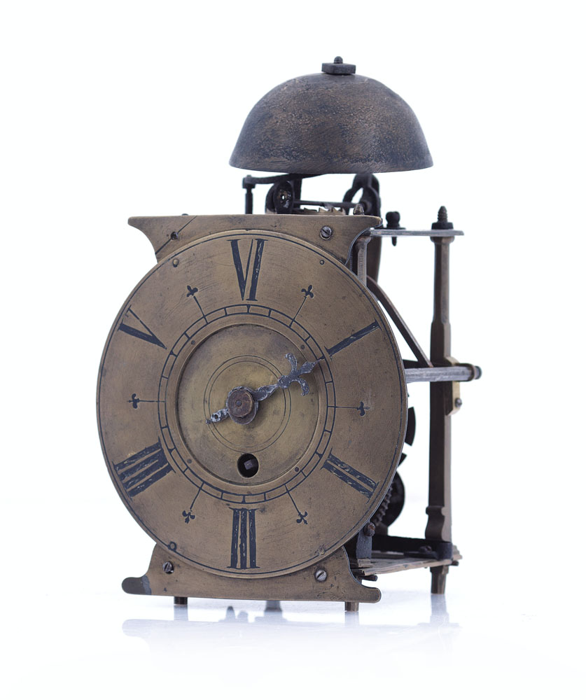PENDOLA A LANTERNA, FINE XVII SECOLO - INIZIO XVIII SECOLO, cassa in ferro e bronzo, quadrante a disco con numerazione fino al sei detta "alla romana", cimato da campana, scappamento a verga; usure, mancanze e da revisionare; pesi mancanti.