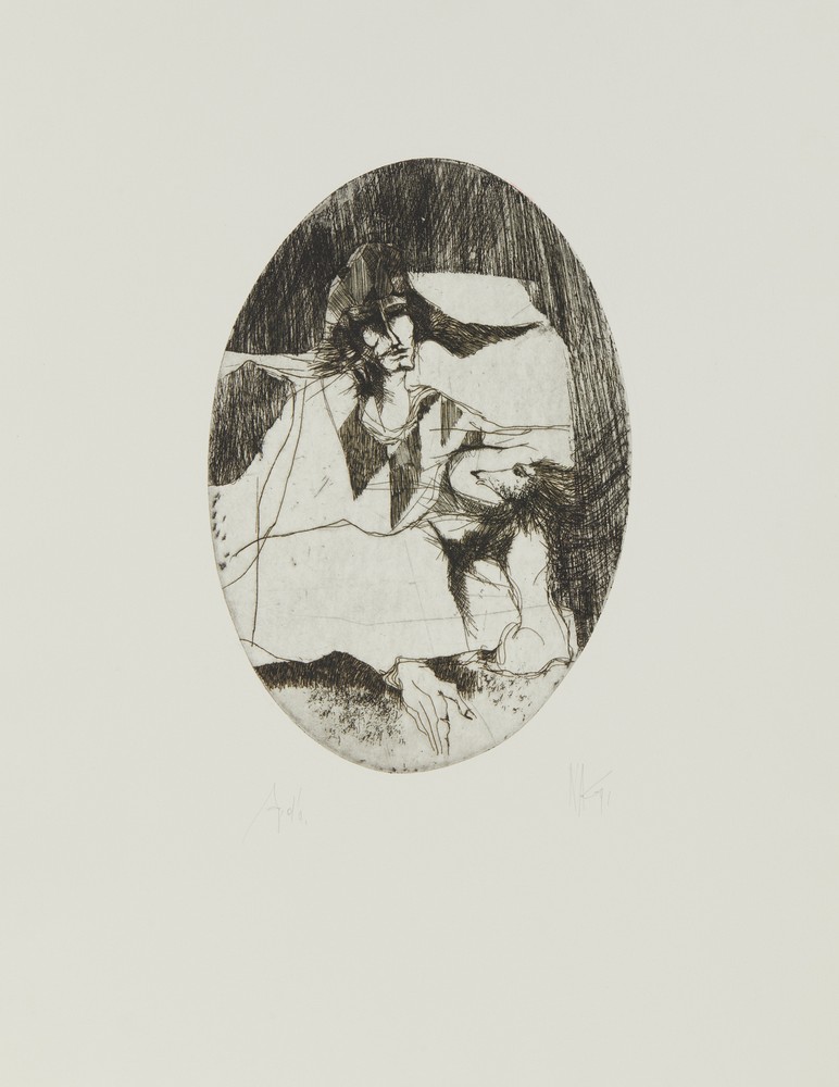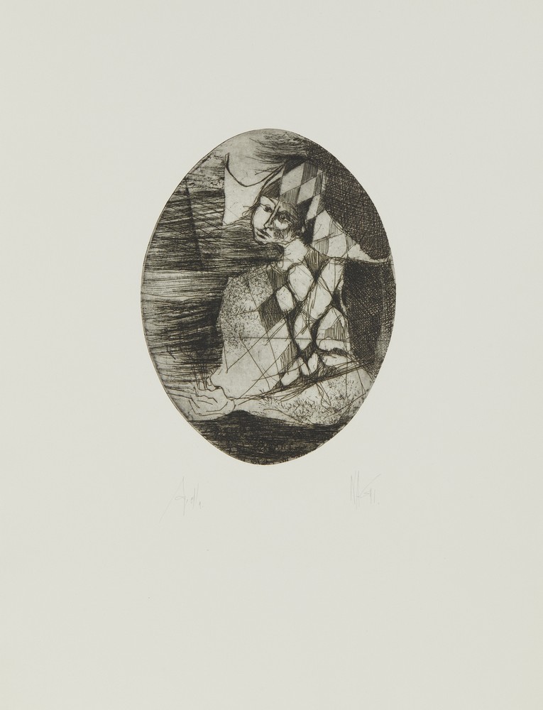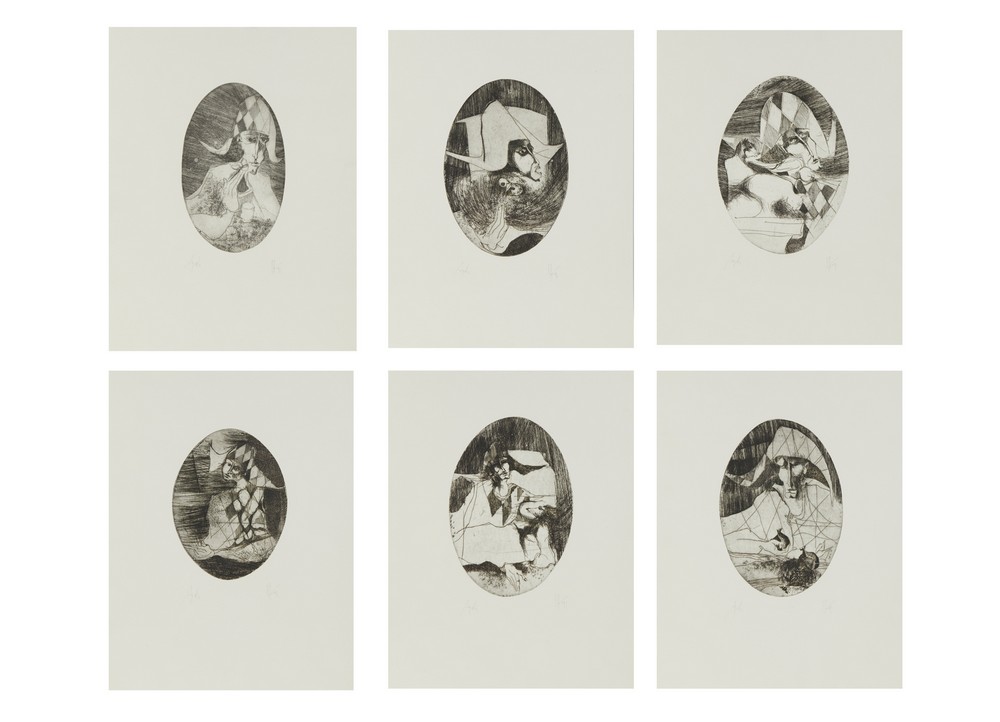 ARNOLDI NAG (n. 1928) CARTELLA COMPOSTA DA N.6 FOGLI: RITRATTI DI ARLECCHINO. 1991. acquaforte. Cm 51,00 x 63,50 x 1,50. firma, data a matita