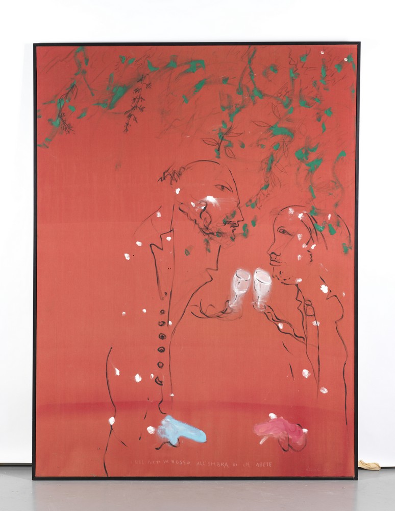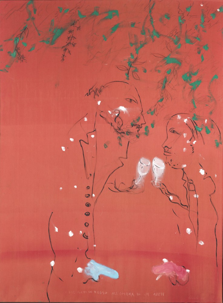 Lot 250 | DESIATO GIUSEPPE (n. 1935) - I DUE POETI IN ROSSO ALL'OMBRA DI UN ABETE.