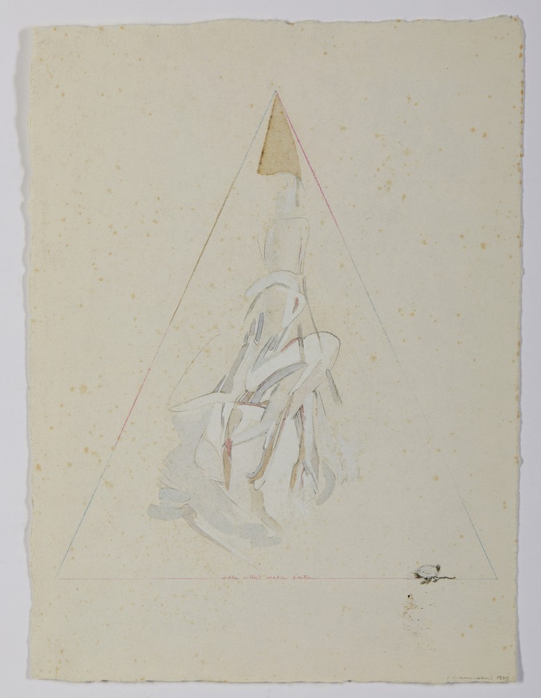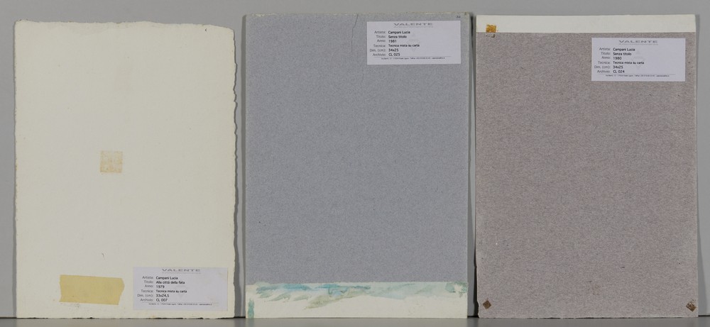 CAMPANI LUCIA LOTTO COMPOSTO DA N.3 DISEGNI: SENZA TITOLO E ALLA CITTA' DELLA FATA. tecnica mista su carta. Cm 25,00 x 34,00. Lotto composto da tre disegni: senza titolo, 1980; senza titolo, 1981 e alla città della fata, 1979.